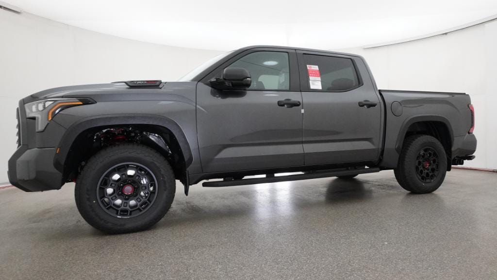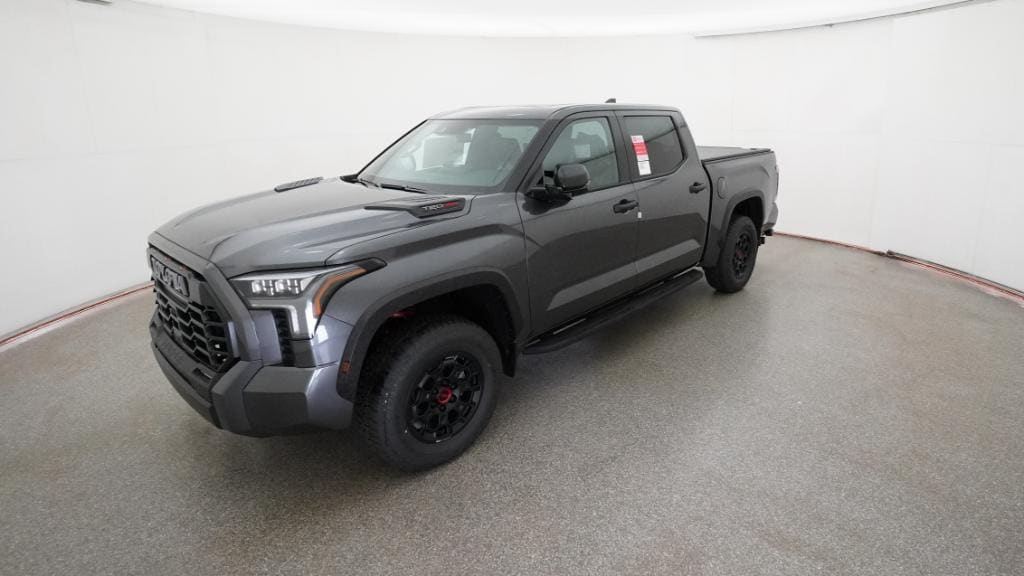 2026 Toyota Tundra Hybrid TRD Pro Magnetic Gray 12 Speakers, 3.31 Axle Ratio, 4-Wheel Disc Brakes, ABS brakes, Air Conditioning, Alloy wheels, AM/FM radio: SiriusXM, Apple CarPlay/Android Auto, Auto High-beam Headlights, Auto-dimming door mirrors, Auto-dimming Rear-View mirror, Automatic temperature control, Brake assist, Bumpers: body-color, Delay-off headlights, Driver door bin, Driver vanity mirror, Dual front impact airbags, Dual front side impact airbags, Electronic Stability Control, Emergency communication system: Safety Connect (up to 10-year trial subscription), Exterior Parking Camera Rear, Front anti-roll bar, Front Bucket Seats, Front Center Armrest, Front dual zone A/C, Front fog lights, Front reading lights, Front wheel independent suspension, Fully automatic headlights, Garage door transmitter: HomeLink, Heated and Ventilated Front Bucket Seats, Heated door mirrors, Heated front seats, Illuminated entry, Knee airbag, Leather Shift Knob, Leather steering wheel, Low tire pressure warning, Memory seat, Navigation system: Drive Connect Cloud Navigation (1-year trial subscription), Occupant sensing airbag, Outside temperature display, Overhead airbag, Overhead console, Panic alarm, Passenger door bin, Passenger vanity mirror, Power door mirrors, Power driver seat, Power moonroof, Power passenger seat, Power steering, Power windows, Radio data system, Radio: Premium Audio with JBL, Rear reading lights, Rear seat center armrest, Rear step bumper, Rear window defroster, Remote keyless entry, Security system, SofTex Seat Trim, Speed control, Speed-sensing steering, Split folding rear seat, Sport steering wheel, Steering wheel mounted audio controls, Tachometer, Telescoping steering wheel, Tilt steering wheel, Traction control, Trip computer, Turn signal indicator mirrors, Variably intermittent wipers, Ventilated front seats, Voltmeter, Wheels: 18" Black Forged Aluminum BBS.