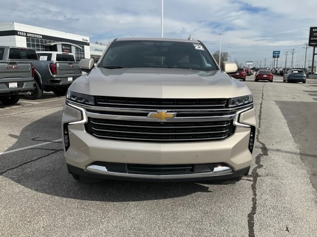 Check out all these great Driver Alert Package (Lane Change Alert w/Side Blind Zone Alert and Rear Cross Traffic Alert), Luxury Package (2nd Row Pwr Release 60/40 Split-Folding Bench Seat, 3rd Row 60/40 Power-Folding Split-Bench Seat, HD Surround Vision, Heated 2nd Row Outboard Seats, Heated Steering Wheel, Memory Settings, Outside Heated Power-Adjustable Mirrors, Power Tilt & Telescopic Steering Column, and Rear Pedestrian Alert), Preferred Equipment Group 1LT (1st & 2nd Row Color-Keyed Carpeted Floor Mats, Auto-Dimming Inside Rear-View Mirror, Automatic Stop/Start, Bose 9-Speaker Stereo Audio System Feature, Bright Front & Rear Door Sill Plates, Color-Keyed Carpeting Floor Covering, Driver & Front Outboard Passenger Airbags, Enhanced Driver Information Center, Floor Console w/Storage Area, Hands-Free Rear Power Programmable Liftgate, Infotainment Display, Leather-Wrapped Steering Wheel, LED Daytime Running Lamps, Memory Settings for Driver, Remote Start, SiriusXM Radio w/360L, Start/Stop System Disable Button, Universal Home Remote, and Wireless Charging), 10-Way Power Driver & Passenger Seat Adjusters, 3.23 Rear Axle Ratio, 3rd row seats: split-bench, 4-Wheel Disc Brakes, 9 Speakers, ABS brakes, Air Conditioning, Alloy wheels, AM/FM radio: SiriusXM with 360L, Apple CarPlay/Android Auto, Auto High-beam Headlights, Auto-dimming Rear-View mirror, Automatic temperature control, Brake assist, Bumpers: body-color, Compass, Delay-off headlights, Driver door bin, Driver vanity mirror, Dual front impact airbags, Dual front side impact airbags, Electronic Stability Control, Emergency communication system: OnStar and Chevrolet connected services capable, Four wheel independent suspension, Front anti-roll bar, Front Bucket Seats, Front Center Armrest, Front dual zone A/C, Front High-Back Reclining Bucket Seats, Front reading lights, Fully automatic headlights, Garage door transmitter, Heated door mirrors, Heated Driver & Front Passenger Seats, Heated front seats, Illuminated entry, Leather steering wheel, Leather-Appointed Seat Trim, Low tire pressure warning, Memory seat, Navigation System, Not Equipped w/Front & Rear Park Assist, Not Equipped w/Heated Rear Outboard Seats, Not Equipped w/Heated/Ventilated Front Seats, Not Equipped w/Steering Column Lock, Occupant sensing airbag, Outside temperature display, Overhead airbag, Overhead console, Panic alarm, Passenger door bin, Passenger vanity mirror, Power door mirrors, Power driver seat, Power Liftgate, Power passenger seat, Power Release 2nd Row Bucket Seats, Power steering, Power windows, Premium audio system: Chevrolet Infotainment System 3, Premium Smooth Ride Suspension, Radio: Chevrolet Infotainment 3 Premium System, Rain sensing wipers, Rear air conditioning, Rear anti-roll bar, Rear reading lights, Rear seat center armrest, Rear window defroster, Rear window wiper, Remote keyless entry, Roof rack: rails only, Security system, Speed control, Speed-sensing steering, Split folding rear seat, Spoiler, Steering wheel mounted audio controls, Tachometer, Telescoping steering wheel, Tilt steering wheel, Traction control, Trip computer, Variably intermittent wipers, Voltmeter, and Wheels: 18" x 8.5" Bright Silver Painted Aluminum. Empire Beige Metallic 2022 Chevrolet Tahoe LT CARFAX One-Owner. **STEERING WHEEL AUDIO CONTROLS**, **POWER LIFTGATE**, **ONE-OWNER**, **LOCAL TRADE**, **KEYLESS ENTRY**, **GREAT CARFAX SERVICE HISTORY**, **AUTOMATIC TRANSMISSION**, **4WD**, **BACK UP CAMERA**, **BLUETOOTH**, **POWER SEAT**, **NAVIGATION**, **Heated Seats**.